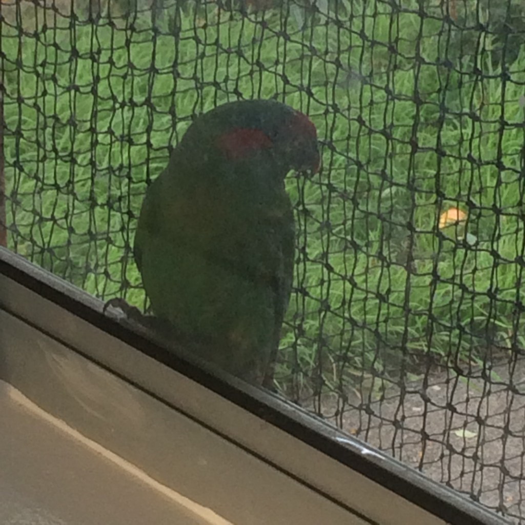 Over the last few weeks more than 30 parakeets joyfully devoured the apples on my one, overgrown apple tree. From dawn until dusk they chatted away, filling their bellies to the point where some had trouble taking off. On the very last day, this one parakeet climbed between the window and the cat pen. It waited until I came right to the window, thanked me by dancing and left.